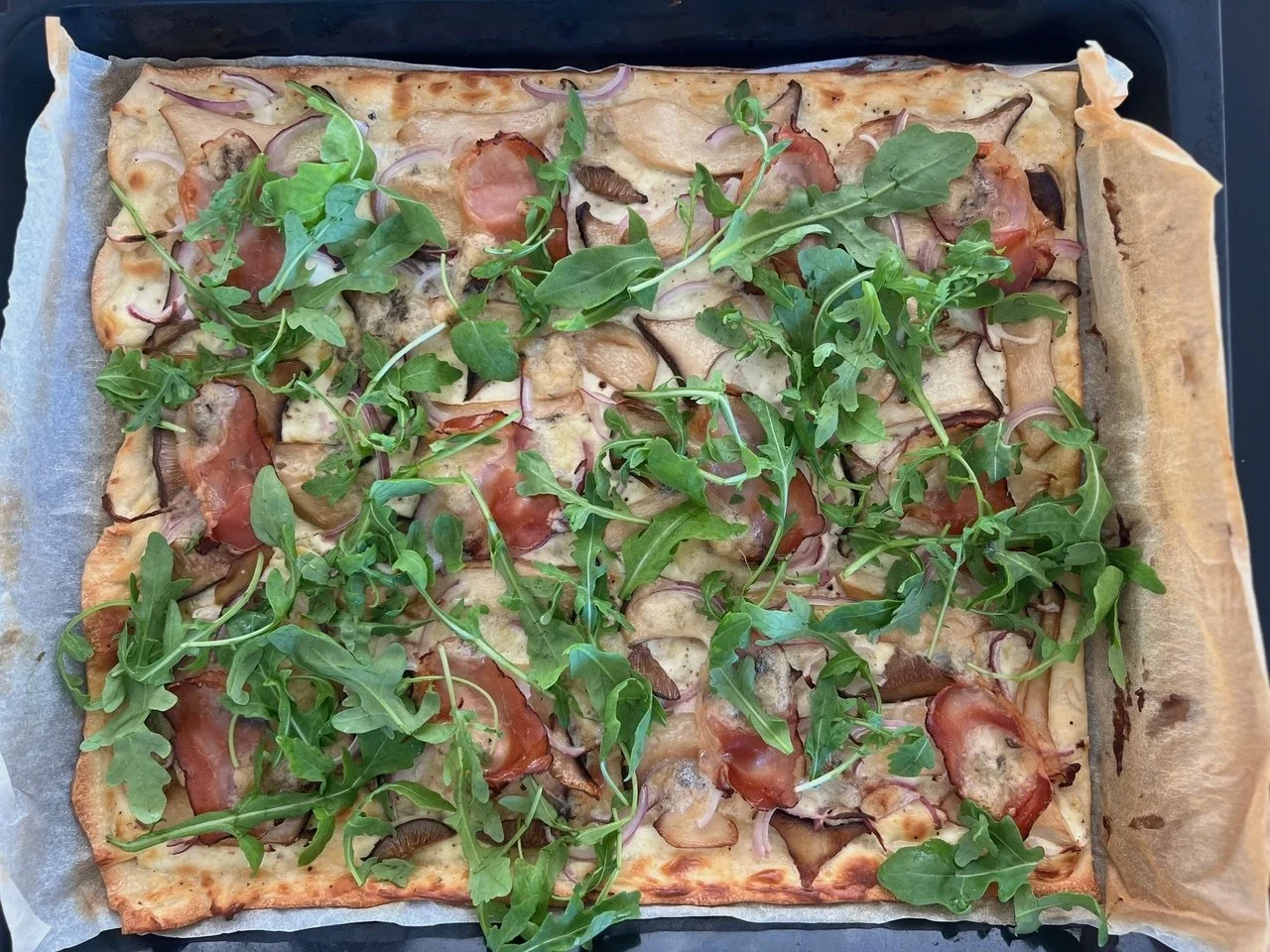 Flammkuchen mit Pilzen, Gorgonzola und Rucola